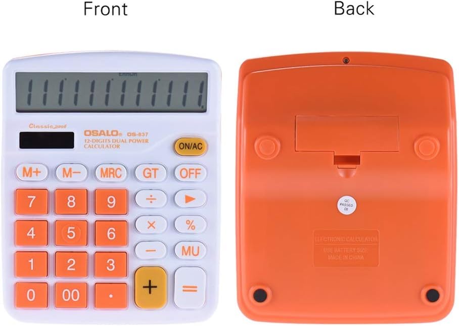 After 12 minutes of inactivity, the calculator will automatically shut down and enter the sleep state, press ON / AC to wake it up.Feature:*Large and clear 12-digit digital display can reduce visual fatigue.*Two power sources, solar energy and 1 AA battery (not included) extend the service time.*Comfortable plastic buttons, strong and durable. The GT function calculates the total.*Other keys: arithmetic key, 3 storage keys, backspace key, percentage key and plus/minus key.*Portable mini size, with colorful and cute design, can better decorate the desktop.*Humanized tilting display screen, easy to view. Very suitable for office, home and school work.specification:material: plasticColor is orangeNumber of digits: 12Memory key: 3Markup / Markdown: YesKey percentage (%): YesTotal (GT): YesBackspace key: yesProduct size: 14 * 11.5 * 5.0 cm/5.5 * 4.5 * 2.0 inches (length * width * height)Product weight: 112g/4.0ozPac: 15 * 12.5 * 4.0cm / 5.9 * 4.9 * 1.6 inches (length * width * height)Package weight: 134g/4.7ozpacking list:1 *Calculator1 *User Manual (Chinese/English)note:Batteries not included.