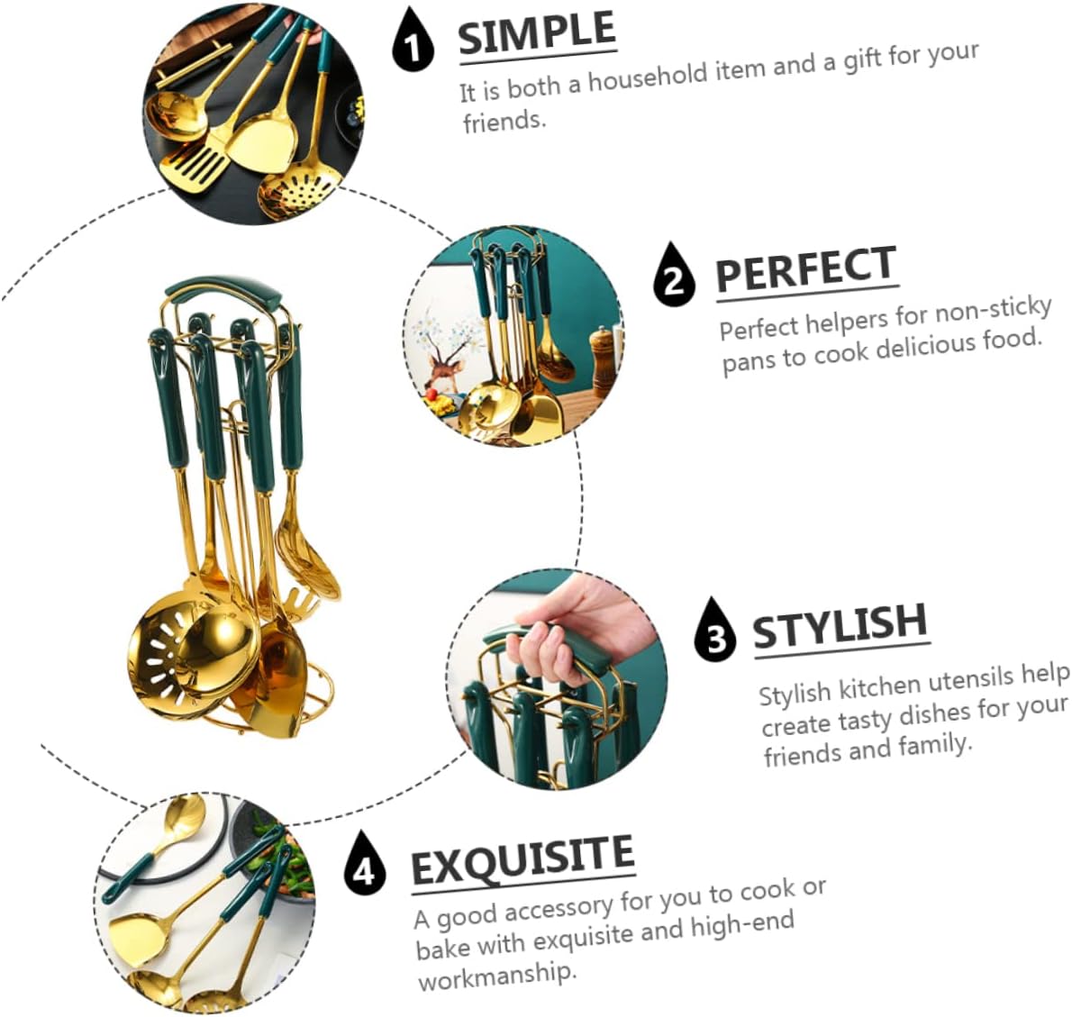 Package List 1 1 x Colander 1 x Soup ladle 1 x Noodle strainer 1 x Spatula 1 x Rice scoop 1 x Pancake turner Characteristics - Colander Size: Approx. 34.00x11.50cm; 13.39x4.53in stainless steel kitchenware - Rice Scoop Size: Approx. 26.00x7.50cm; 10.24x2.96in stainless steel kitchen utensil - Spatula Size: Approx. 33.50x33.50cm; 13.19x13.19in kitchenware kit - Color: Green cooking spoon - Material: Stainless steel, ceramic kitchen utensils - Rack Size: Approx. 39.00X13.00X13.00cm; 15.33X5.11X5.11in utensils set for home - Noodle Strainer Size: Approx. 30.00x7.50cm; 11.81x2.96in non-stick cooking tools - Pancake Turner Size: Approx. 34.50x7.50cm; 13.58x2.96in non-stick utensils - Soup Ladle Size: Approx. 31.00x9.00cm; 12.20x3.54in cookware kitchen gadgets - Your stylish and colorful new kitchen utensils will be such a pleasure to use, so you'll soon be creating heavenly dishes for friends and utensil set. - They are non-stick, stain resistant, and heat-resistant, so they are easy to clean and healthy for your life cooking utensils. - This utensil set is made of food grade materials, and safe heat-resistant cooking tools. - They will never cut your hands and mouth because of smooth surface kitchen shovel set.Goods Descriptionkitchenware kit Different dishes cooking needs different tools, the spoons can help you to make delicious dishes well.non-stick utensils The spoons or spatulas are .cookware kitchen gadgets This utensil set can be used for many purposes: stir, mix, strain, and/or whisk.heat-resistant cooking tools They are always the right tools for any kitchen task