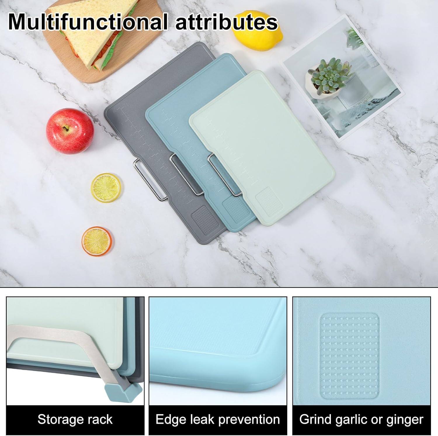 Parts List:1 × Large Cutting Board1 × Medium Chopping Board1 × Small Chopping Board1 × StandProduct Specification:Description:This cutting board set includes 3 different sizes of cutting boards for different scenarios to meet your needs of cutting meat, seafood, fruits or vegetables in your daily life. It allows you to quickly prepare ingredients in the same time.Key Feature:Practical Cutting Board Set: Our cutting board set includes 3 different sizes of cutting boards and 1 stand, which not only allows you to quickly prepare multiple ingredients, but also can easily store the boards when you don't need to use them. You can place it in the corner of the countertop or in the cabinet to save space.Specification:Product Name: Cutting Board SetColor: Gray, Blue and Green CombinationMaterial: PP + Stainless SteelSize:Large Cutting Board: 29.3 x 21.7cm / 11.53 x 8.54 inchesMedium Chopping Board: 26.3 x 18.7cm / 10.35 x 7.36 inchesSmall Chopping Board: 23.5 x 16.8cm / 9.25 x 6.61 inchesStand: 10.2 x 26.2cm / 4 x 10.3 inchesNote:1.There may be slight differences between the picture and the actual color of the commodity. We will try our best to show you the exact color.2.Please allow slight dimension differences due to manual measurement.